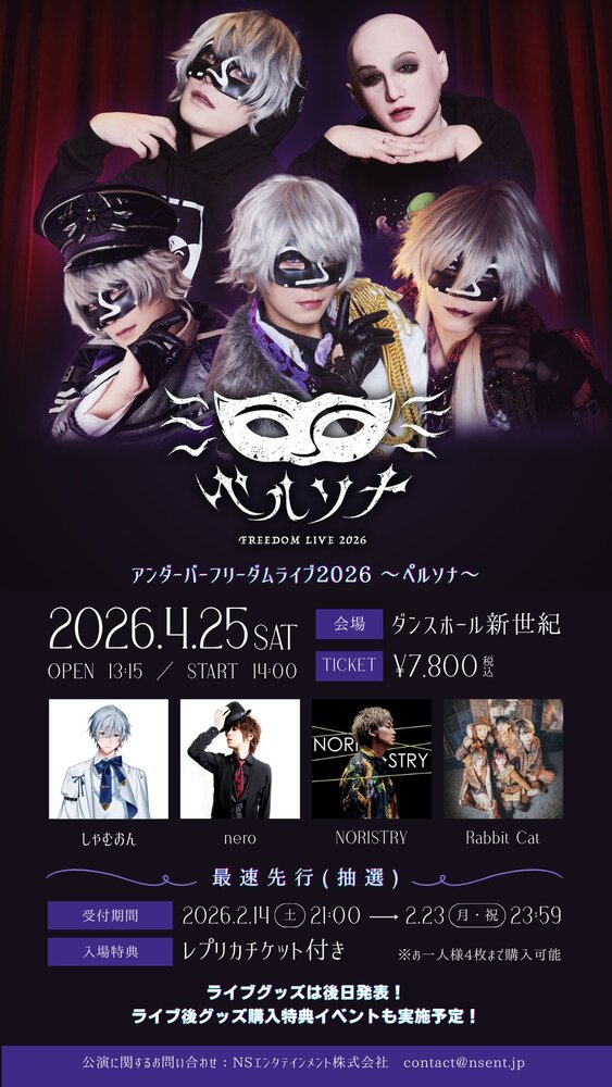 【LIVE】アンダーバーフリーダムライブ2026〜ペルソナ〜 SCHEDULE 2026/04/25(土) ダンスホール新世界 地図を表示 📅日程 2026/04/25 📍会場 ダンスホール新世界 🎉出演 __(アンダーバー)/ しゃむおん / nero / NORISTRY / Rabbit Cat 🎫チケット e+:https://eplus.jp/un-san/ URLをコピーする 報告する
